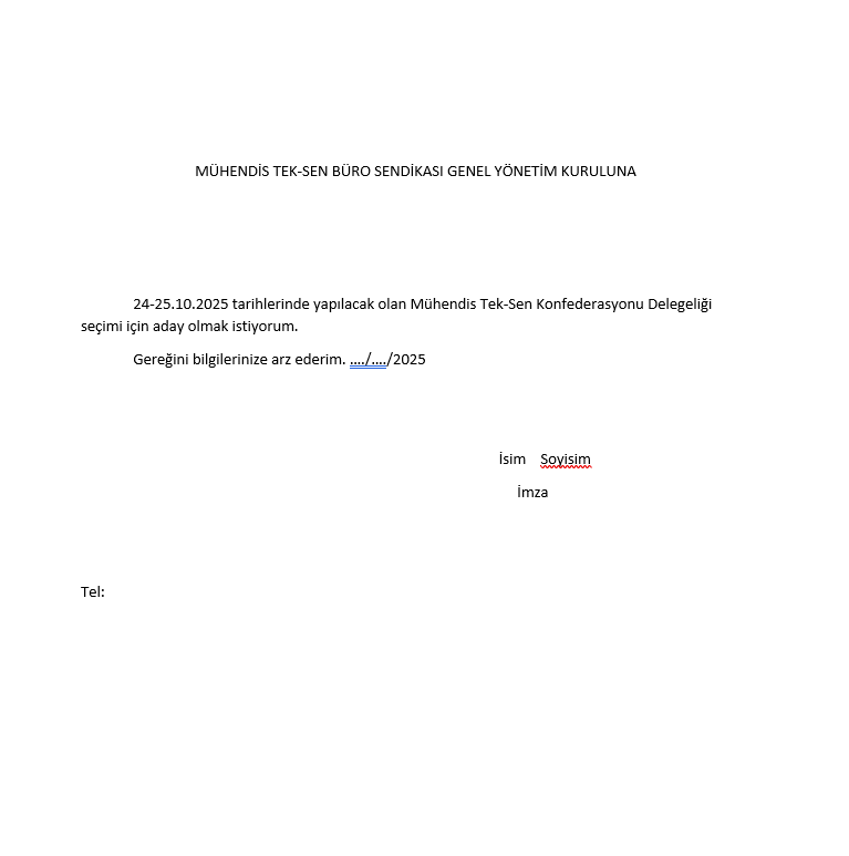 bilgi@muhendisteksenburo.org.tr mail adresine gönderilmesini veya Sendika Genel Merkezine elden/posta yoluyla 22.10.2025 tarihine kadar ulaÅŸtırılmasını ve